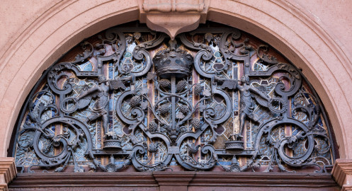 Heidelberg - Heiliggeistkirche - Nordseite - Mittleres Nordportal - Schmiedeeiserner Rundbogen über der Tür (aufgenommen im März 2015, am späten Nachmittag)